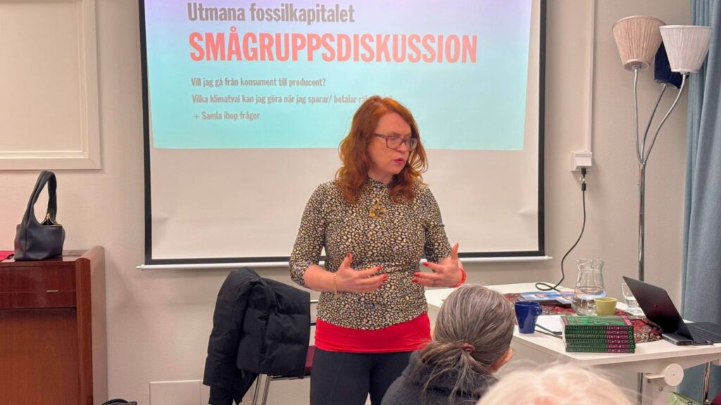 Föreläsningen Klimaträkning kan bokas av föreningar och kretsar kring hur vi kan mobilisera vår gemensamma ekonomiska styrka – och utmana fossilkapitalet. – Konfliktlinjen i klimatkrisen står mellan fossilkapitalet och 99 procent av mänskligheten. Därför behöver vi göra mer än att sätta press på politiker att agera för netto-noll, sa Rebecka Bohlin under föreläsningen. Hon talade om vad som skapar mening i tillvaron och om konkreta steg vi kan ta här och nu – utöver politisk påverkan. – Alla betalar räkningar. Om vi sätter klimatet först när vi väljer bank, sparform, elbolag och mobilabonnemang har vi en enorm ekonomisk makt tillsammans.