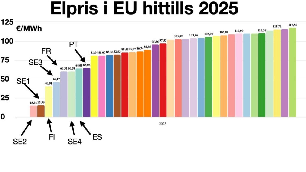Som stapeldiagrammet visar har inte de södra elområdena i Sverige höga elpriser jämfört med andra länder i EU, det är de norra elområdena som har betydligt lägre priser.