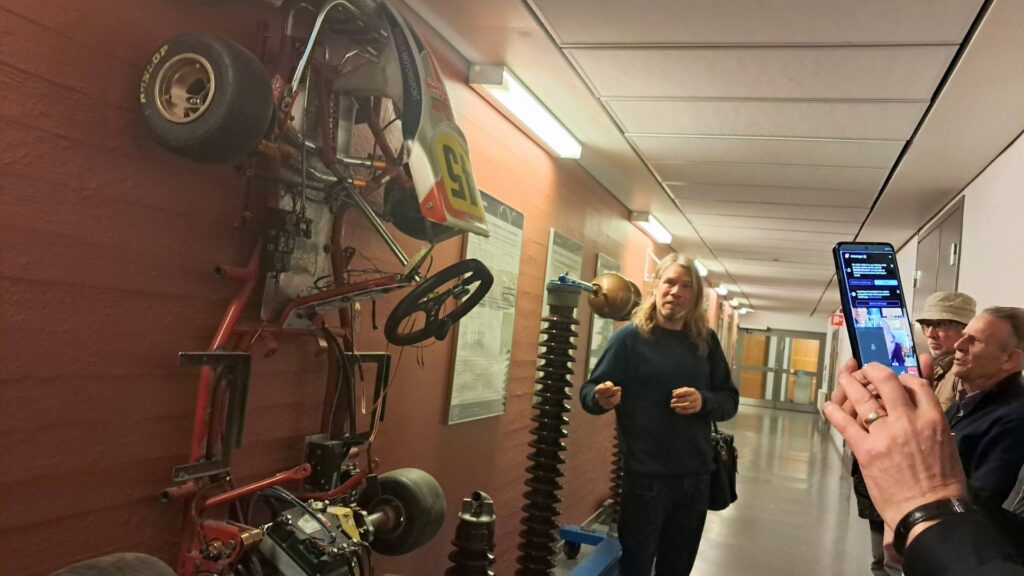 På Chalmers pågår även experiment i mindre skala av kandidatstudenter. David Steen visar en gokart som tagits fram för att laddas medan den kör, genom en laddslinga i körbanan.
