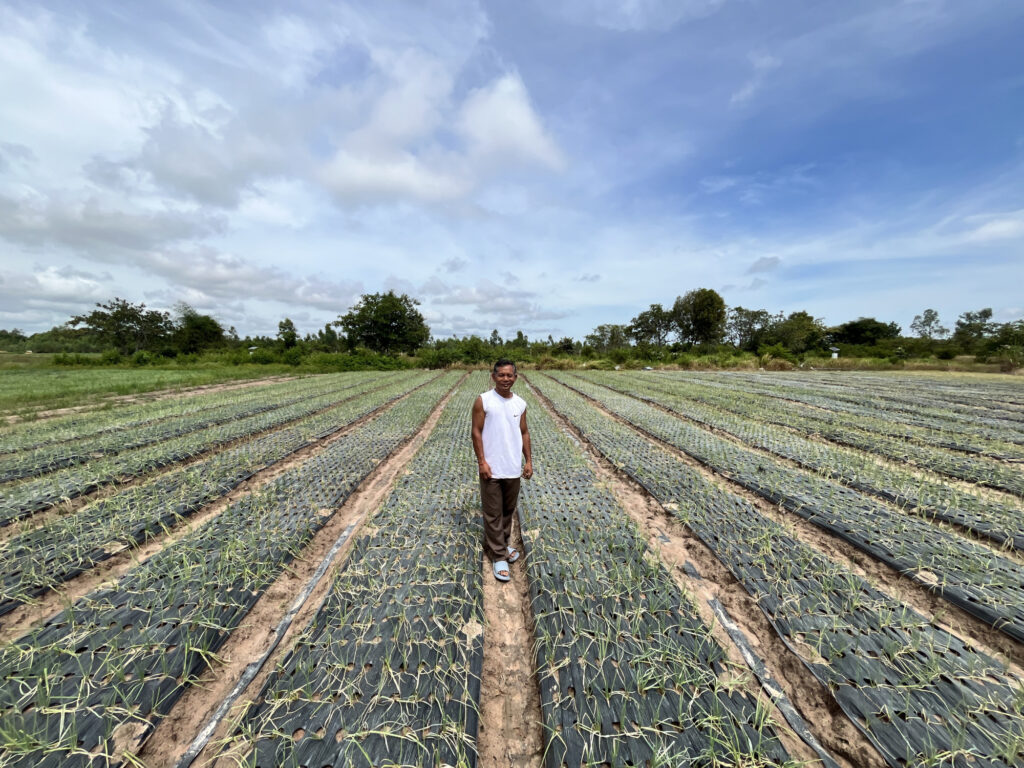 Sun Sithol visar sin lödodling som vattnas av solbevattningssystemet som drivs av jordbrukskooperativet Toeuk Hout Meanchey i Kampong Chhnang, Kambodja. Foto: Vin Aranas/I-JET